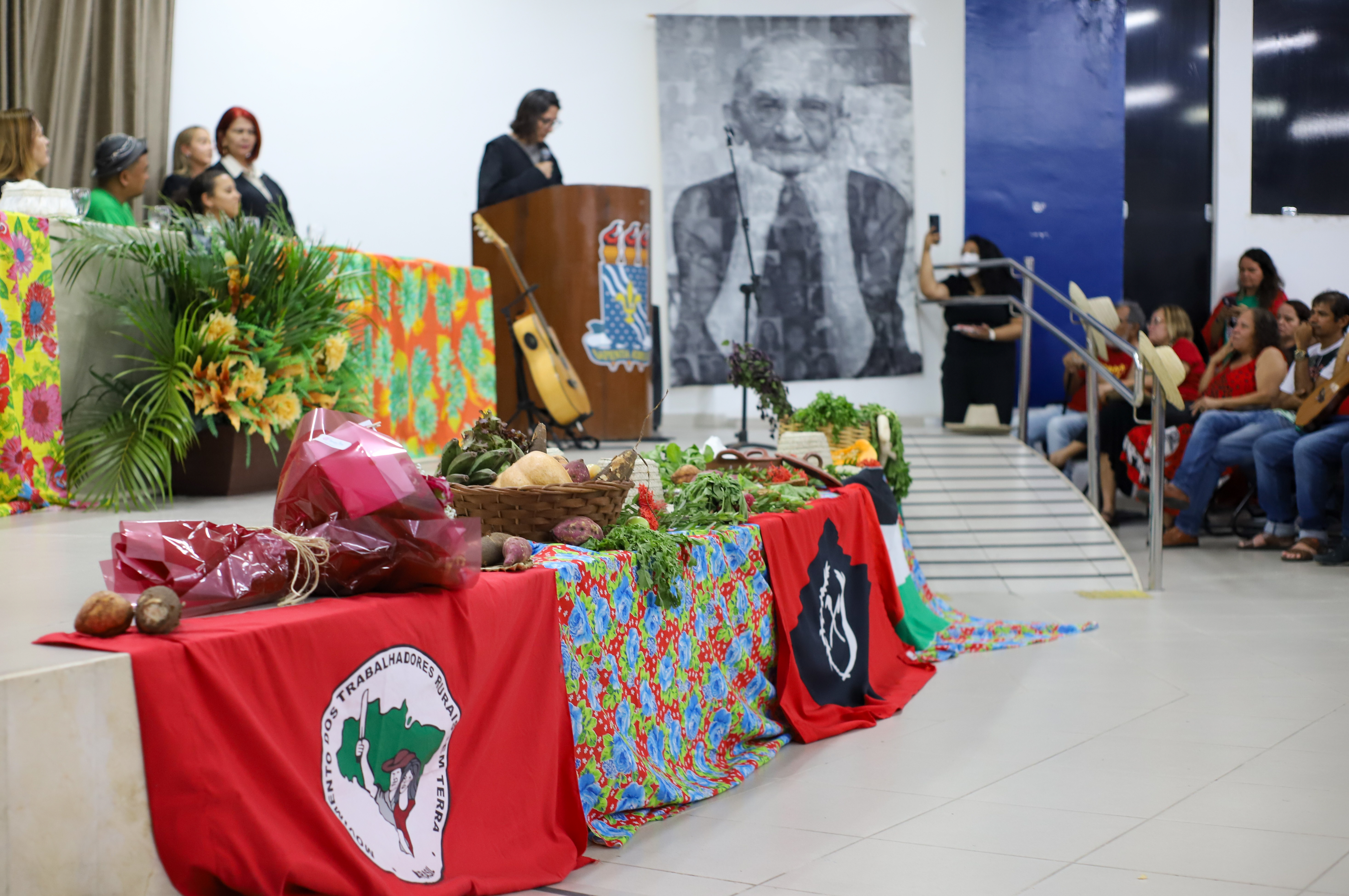 Os gritos de “Viva Elizabeth Teixeira” foram repetidos inúmeras vezes ao longo da solenidade. No palco principal a mesa diretiva foi formada pela Reitora Terezinha Domiciano, pela Vice-reitora Mônica Nóbrega, pela professora Fabrícia Sousa Montenegro (CCHSA), pela Diretora do CE Adriana Diniz, pelo Coordenador da Secretaria dos Órgãos Deliberativos da Administração Superior Marcelo Sitcovsky, além de Rafael Reginaldo da Comissão Pastoral da Terra, Dilei Aparecida Schochet do Movimento dos Sem-Terra e Alane Maria de Lima do Memorial das Ligas e Lutas Camponesas.